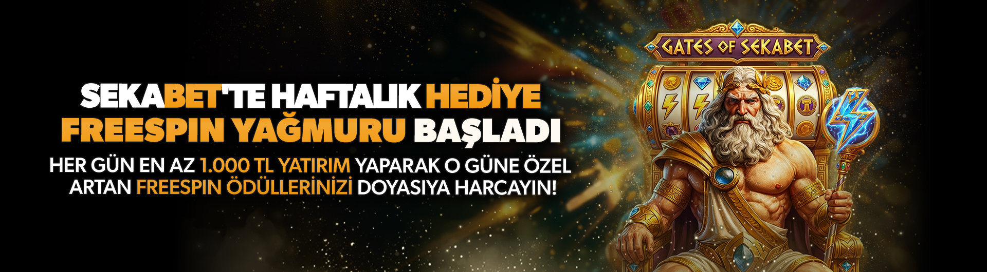 Haftanın her günü artan freespin değerleriyle her gün tek seferde en az 1.000 TL yatırım yaparak o güne özel freespin ödüllerinizi Pragmatic Play’in Gates of Sekabet oyununda doyasıya harcayın!